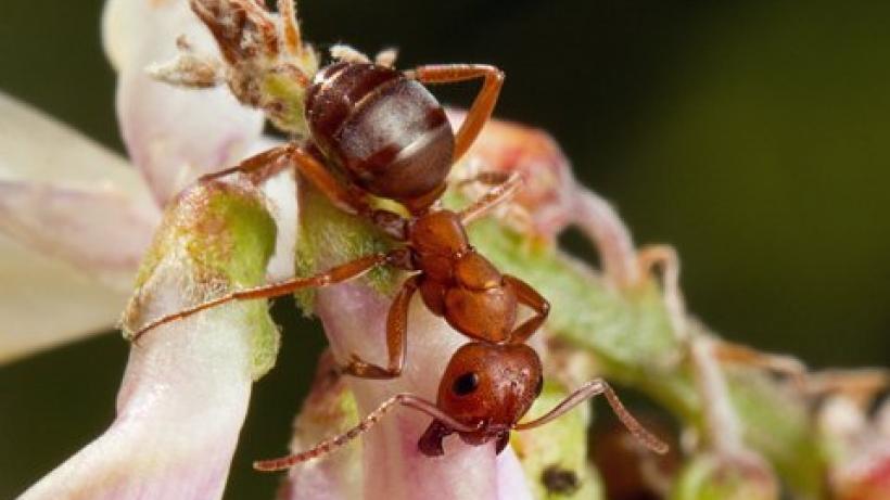 • An ant infected with larvae of the trematode, Dicrocoelium, clinging to a flower in Cypress Hills Park. (photo by A. Hurly)